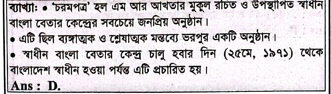 বাঙালি জাতির মুক্তি সনদ হলো (the charter of Freedom for the Bengali nation is)- Option A: ছয় দফা (six point) , Option B: এগারো দফা ( Eleven point ) , Option C: ৭ মার্চ ভাষণ (7th March speech ), Option D: ২১ দফা (21 point), correct answer is: ছয় দফা…