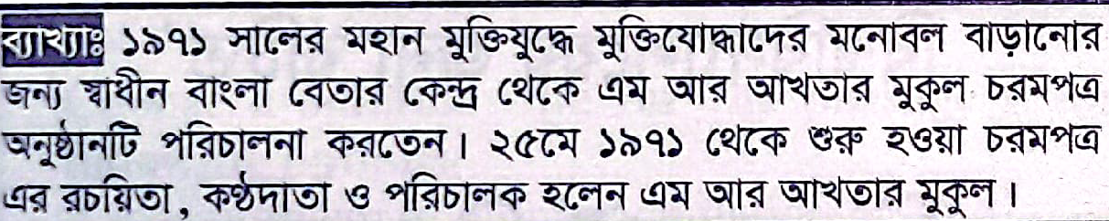 Correct Answer is: স্বাধীন বাংলা বেতার কেন্দ্র থেকে প্রচারিত অনুষ্ঠান