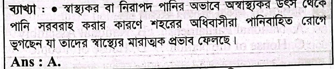ঢাকা শহরের বেশ কিছু এলাকায় অনিয়মিত পানি সরবরাহ এক নিত্যকার বৈশিষ্ট্য। গ্রীষ্মকালীন সময়ে এটি প্রকট আকার ধারণ করে। প্রকৌশলীরা বিদ্যুৎ বিভ্রাটকেই এজন্য মূলতঃ দায়ী করেন। এছাড়া আশঙ্কা জনক ভাবে সবুজ স্তরকে বিভিন্ন স্থাপনায় রূপান্তরের ফলে মাটির পানি শোষণ ক্ষমতা হ্রাস পেয়েছে। ফলশ্রুতিতে ভূ-অভ্যন্তরস্থ জলাধার প্রাকৃতিক নিয়মে পূর্ন হবার হারও কমে গেছে। এমতাবস্থায় এই এলাকাসমূহের অধিবাসীরা নানা প্রকার অস্বাস্থ্যকর উৎস থেকে পানি সংগ্রহ করে দৈনন্দিন চাহিদা মেটাতে বাধ্য হচ্ছেন। এই উৎসগুলোর ব্যবহার পানিবাহিত নানা রোগের প্রাদুর্ভাবের জন্য অনেকাংশে দায়ী। আলোচ্য অনুচ্ছেদটিতে পানি ব্যবহারকারীগণ গৃহীত ব্যবস্থার কুফল কিভাবে ভোগ করেছেন?