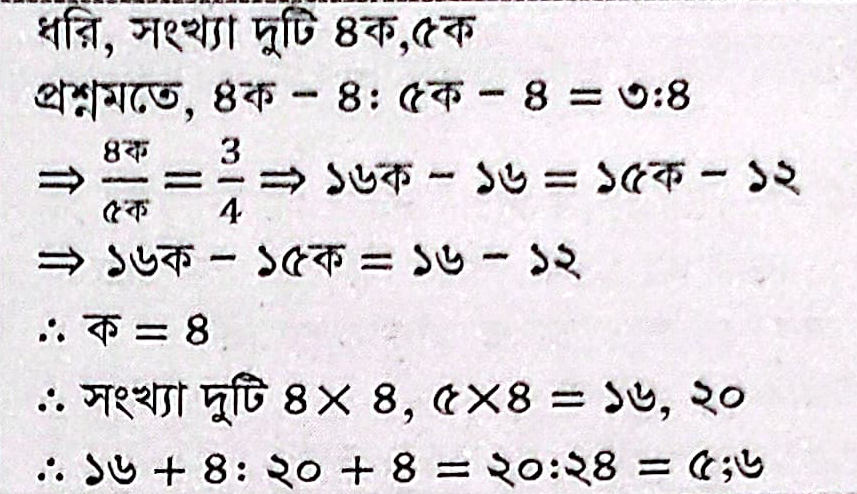 দুটি সংখ্যার অনুপাত ৪:৫। সংখ্যা দুটি হতে ৪ করে কমালে তাদের অনুপাত হয় ৩ : ৪। সংখ্যা দুটির সাথে ৪ যোগ করলে তাদের অনুপাত কত হবে?