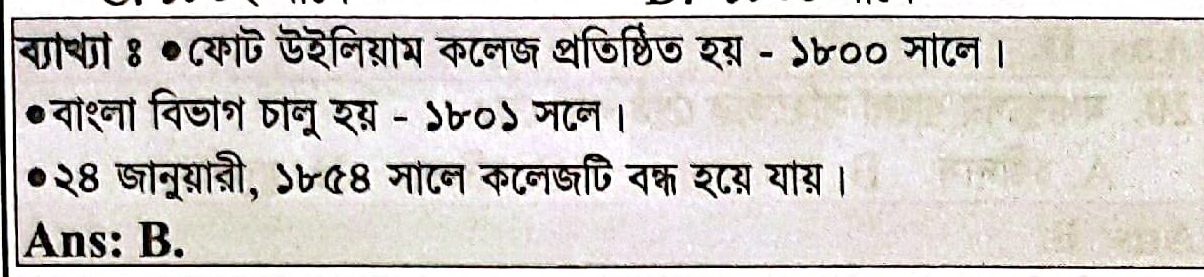 ফোর্ট উইলিয়াম কলেজে বাংলা বিভাগ খোলা হয়-
