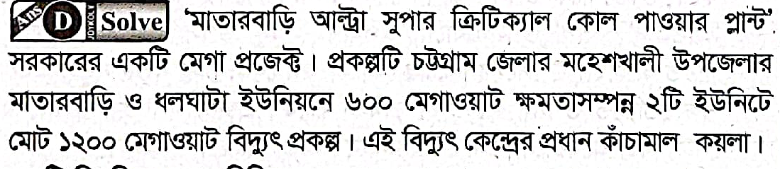 মাতারবাড়ি বিদ্যুৎকেন্দ্রের কাঁচামাল হলো (The raw material of Matarbari Power Plant is)-