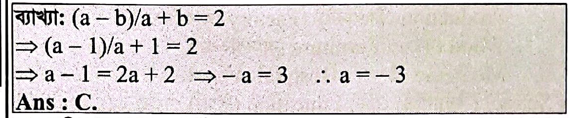 যদি (a-b)/(a+b)=2 হয়, এবং b=1 হয়, তবে a এর মান কত?