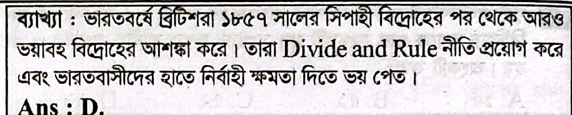 “লর্ড কার্জন তো কংগ্রেসের মৃত্যু দেখে যাবে এই আশা আন্তরিকভাবেই লালন করতেন । আমলাতন্ত্রের উচ্চতর স্তরে বাঙালি বাবুর প্রবেশ ছিল তার চক্ষুশূল। কারণ আছে বাঙালিরা ব্রিটিশদের জন্য সংরক্ষিত দুর্গে গিয়ে হানা দেওয়া শুরু করে দিয়েছিল । এই অনুচ্ছেদে ব্রিটিশ শাসনের কোন ইচ্ছার প্রতিফলন ঘটেছে ?
