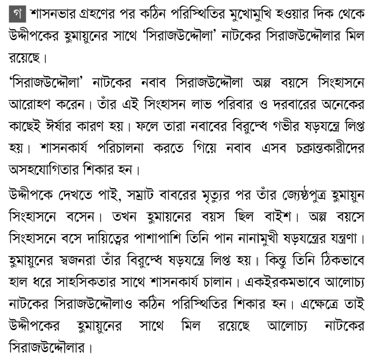 ইতিহাস বলে সম্রাট বাবরের মৃত্যুর পর তার জ্যেষ্ঠপুত্র হুমায়ুন যখন সিংহাসনে বসেন, তখন তার বয়স মাত্র বাইশ বছর। একদিকে অল্প বয়সে শাসনকার্যের গুরুদায়িত্ব, অন্যদিকে সিংহাসনে বসার পর থেকেই চলে নানামুখী ষড়যন্ত্র। এ রকম প্রতিকল পরিস্থিতিতেও যুবক শাসক হুমায়ুন ঠিকভাবে হাল ধরে অত্যন্ত সাহসিকতায় শাসনকার্য চালিয়ে যান। হুমায়ুনের ভাইয়েরা এবং আত্মীয়-স্বজনেরা যদিও সহযোগিতার পরিবর্তে ষড়যন্ত্রে লিপ্ত ছিল, তথাপি দুর্দান্ত প্রতাপে শক্ত হাতে সবকিছুর মোকাবেলা করেন তিনি।উদ্দীপকের হুমায়ুনের সাথে `সিরাজউদ্দৌলা` নাটকের কোন চরিত্রের মিল রয়েছে এবং কীভাবে? আলোচনা করো।