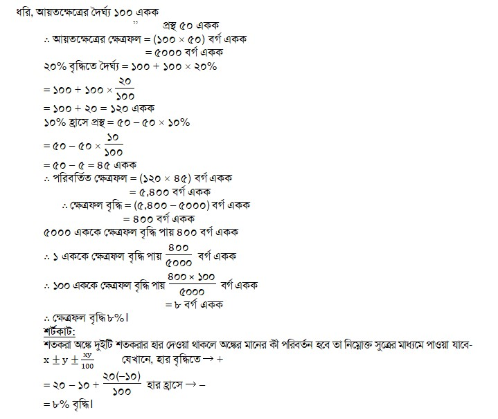 একটি আয়তাকার ক্ষেত্রের দৈর্ঘ্য ২০% বৃদ্ধি এবং প্রস্থ ১০% হ্রাস করা হলে ক্ষেত্রফলের শতকরা কত পরিবর্তন হবে?