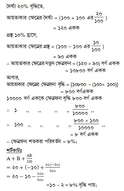 একটি আয়তাকার ক্ষেত্রের দৈর্ঘ্য ২০% বৃদ্ধি, প্রস্থ ১০% হ্রাস করা হলে, ক্ষেত্রফলের শতকরা কত পরিবর্তন হবে?