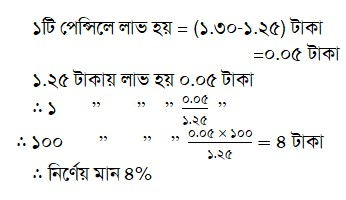 একটি পেনসিল ১.২৫ টাকায় কিনে ১.৩০ টাকায় বিক্রয় করলে, শতকরা কত লাভ হবে?