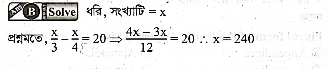 একটি সংখ্যার ⅓ অংশ থেকে ¼ অংশ বিয়োগ করলে বিয়োগফল 20 হয়। সংখ্যাটি কত?