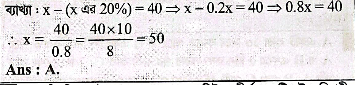 একটি সংখ্যা তার নিজের ২০% অপেক্ষা ৪০ বেশি হলে সংখ্যাটি কত?