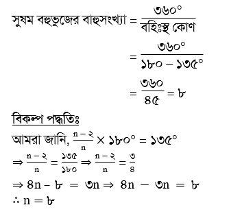 একটি সুষম বহুভুজের একটি অন্তঃকোণের পরিমাণ ১৩৫° হলে বহুভুজটির বাহুর সংখ্যা হবে–