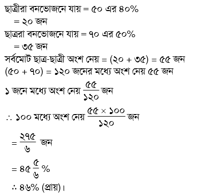 একটি স্কুলে ৫০ জন ছাত্রী ও ৭০ জন ছাত্র আছে। ছাত্রীদের ৪০% এবং ছাত্রদের ৫০% এক বনভোজনে গিয়ে থাকলে মোট ছাত্র-ছাত্রীর কত শতাংশ বনভোজনে গিয়েছিল?