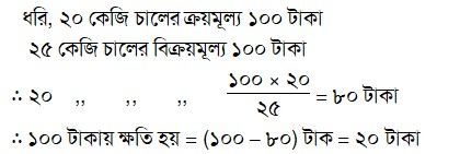 এক ব্যক্তি চাল বিক্রয় করে দেখল যে, ২৫ কেজি চালের বিক্রয়মূল্য ২০ কেজি চালের ক্রয়মূল্যের সমান। তার শতকরা কত ক্ষতি হলো?