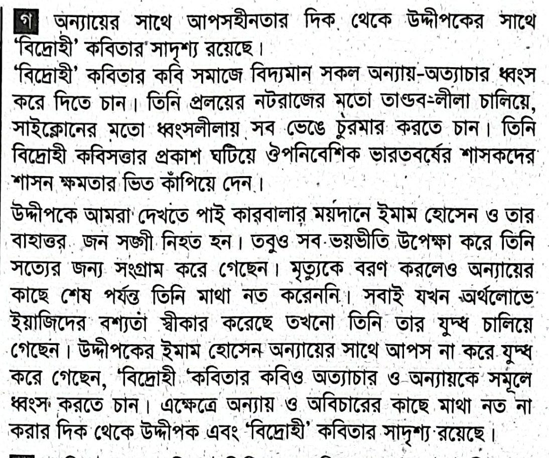 এ কারবালার ময়দানে ইমাম হোসেন তাঁর বাহাত্তর জন সঙ্গীসহ নৃশংস হত্যাকাণ্ডের শিকার হয়েছেন। শত অনুরোধ ও ভয়ভীতি উপেক্ষা করে তিনি সত্য ও সুন্দরের প্রতিষ্ঠায় সংগ্রাম করেছেন। মৃত্যুকে বরণ করে নিয়েছেন, কিন্তু অন্যায়ের কাছে মাথানত করেননি। সকলেই যখন অর্থলোভে, রাজ্যলোভে বা মৃত্যুভয়ে ইয়াজিদের বশ্যতা স্বীকার করে নিয়েছেন, তখন তিনি একাই ইয়াজিদি শাসনের ভীত কাঁপিয়ে দিয়েছেন।উদ্দীপকের সঙ্গে `বিদ্রোহী` কবিতার সাদৃশ্য কোন দিক থেকে?- ব্যাখ্যা করো।