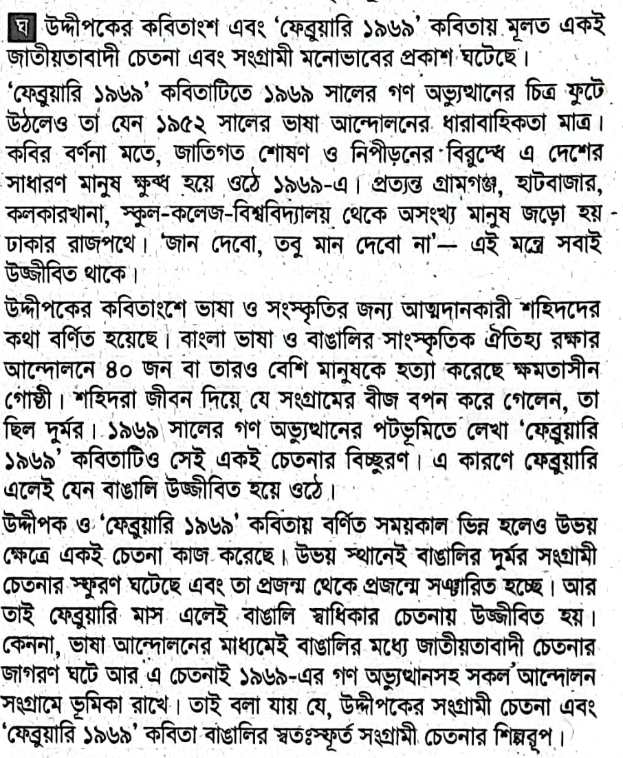 ওরা চল্লিশজন কিংবা আরও বেশিযারা প্রাণ দিয়েছে ওখানে-রমনার রৌদ্রদগ্ধকৃষ্ণচূড়ার গাছের তলায়,ভাষার জন্য, মাতৃভাষার জন্য-বাংলার জন্যযারা প্রাণ দিয়েছে ওখানেএকটি দেশের মহান সংস্কৃতির মর্যাদার জন্য।`উদ্দীপকটি `ফেব্রুয়ারি ১৯৬৯` কবিতার সম্পূর্ণ ভাবকে ধারণ করতে পারেনি।`- আলোচনা করো।