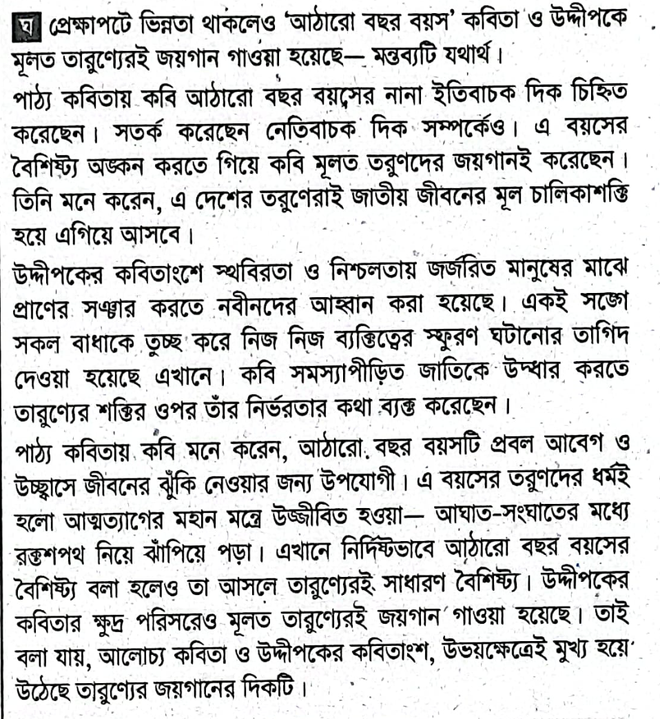 ওরে নবীন ওরে আমার কাঁচাওরে সবুজ ওরে অবুঝআধ-মরাদের ঘা মেরে তুই বাঁচা।রক্ত আলোর মদে মাতাল ভোরেআজকে যে যা বলে বলুক তোরে,সকল তর্ক হেলায় তুচ্ছ করে।পুচ্ছটি তোর উচ্চে তুলে নাচাআয় দূরন্ত আয় রে আমার কাঁচা।`উদ্দীপকে এবং `আঠারো বছর বয়স` কবিতায় মূলত তারুণ্যের জয়গান গাওয়া হয়েছে।` মন্তব্যটি ব্যাখ্যা করো।