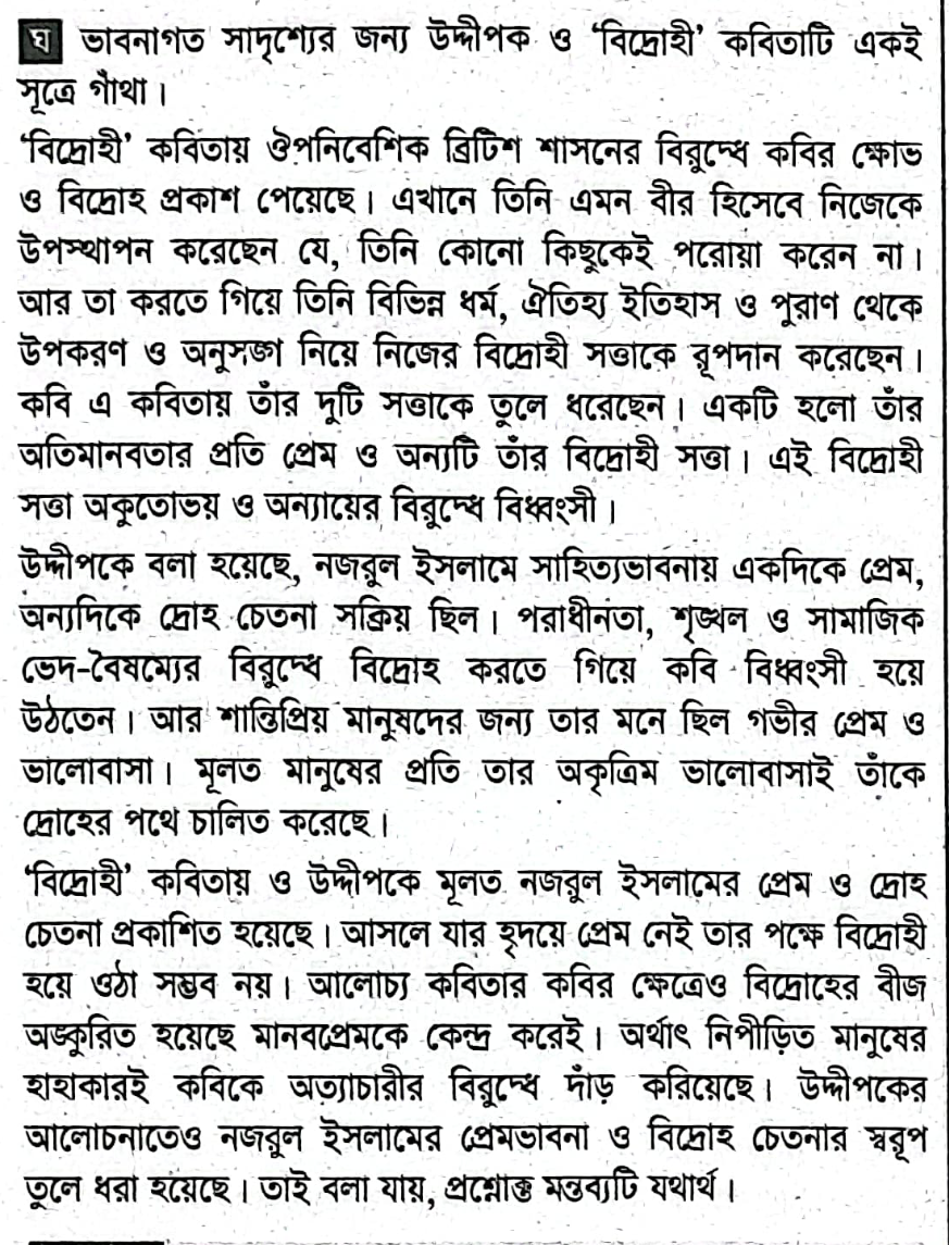 কবি কাজী নজরুল ইসলাম বিদ্রোহে ছিলেন হিমালয়ের মতো সুউচ্চ এবং জীবন্ত আগ্নেয়গিরির মতো দহন ক্ষমতাসম্পন্ন এবং প্রেমের ক্ষেত্রে ছিলেন স্রোতঃস্বিনী নদীর জোয়ারের মতো। তাঁর প্রেমের ফেনায়িত তরঙ্গ কুল ছাপিয়ে একাকার হয়ে গেছে। বিদ্রোহের পিছনেও ছিল তাঁর খরস্রোতা নদীর মতো দেশপ্রেম।`উদ্দীপক ও `বিদ্রোহী` কবিতাটি একই সূত্রে গাঁথা।`- বিশ্লেষণ করো।