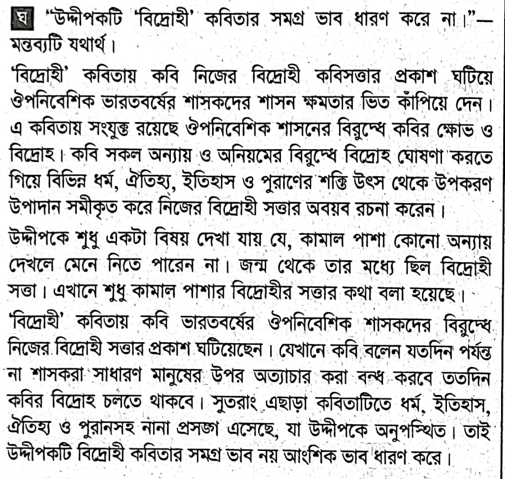 কামাল পাশা কোন বিষয়ে অন্যায় দেখলে মেনে নিতে পারতেন না। জন্ম থেকে তার মধ্যে ছিল বিদ্রোহী সত্তা। দেশের সুলতান অন্য দেশের কাছে অবজ্ঞার পাত্র। কামাল পাশা অন্তরে অনুভব করেন এই অবস্থার পরিবর্তন প্রয়োজন। শেষ পর্যন্ত তিনি এই পরিবর্তন করতে সক্ষম হন এবং তুরস্ককে একটি আধুনিক রাষ্ট্রে পরিণত করেন।উদ্দীপকের সাথে `বিদ্রোহী কবিতার সাদৃশ্যপূর্ণ দিকটি ব্যাখ্যা করো।`উদ্দীপকটি `বিদ্রোহী` কবিতার সমগ্র ভাব ধারণ করে না।`- মন্তব্যটির যথার্থতা বিচার করো।