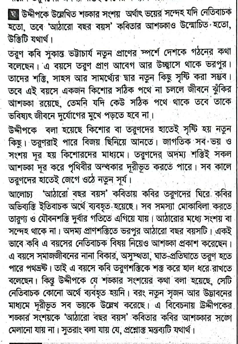 কিশোর তোমার দুই হাতে দুইসূর্য উঠেছে জেগে।মানুষের হাতে অবাক সূর্যোদয়,যায় পুড়ে যায় মর্ত্যের অমানিশাশঙ্কার সংশয়।`উদ্দীপকের `শঙ্কার সংশয়` যদি নেতিবাচক হতো তাহলে `আঠারো বছর বয়স` কবিতার কবির আশঙ্কাও উন্মোচিত হতো।`-মন্তব্যটির যৌক্তিকতা বিচার করো।
