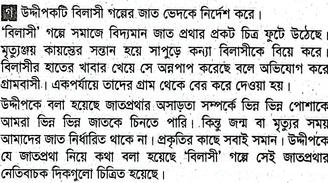 কেউ মালা, কেউ তসবি গলায়তাইতে কী জাত ভিন্ন বলায়,যাওয়া কিংবা আসার বেলায়জাতের চিহ্ন রয় কার রে।উদ্দীপকটিতে `বিলাসী` গল্পের কোন দিকটি ফুটে উঠেছে? বুঝিয়ে লেখো।