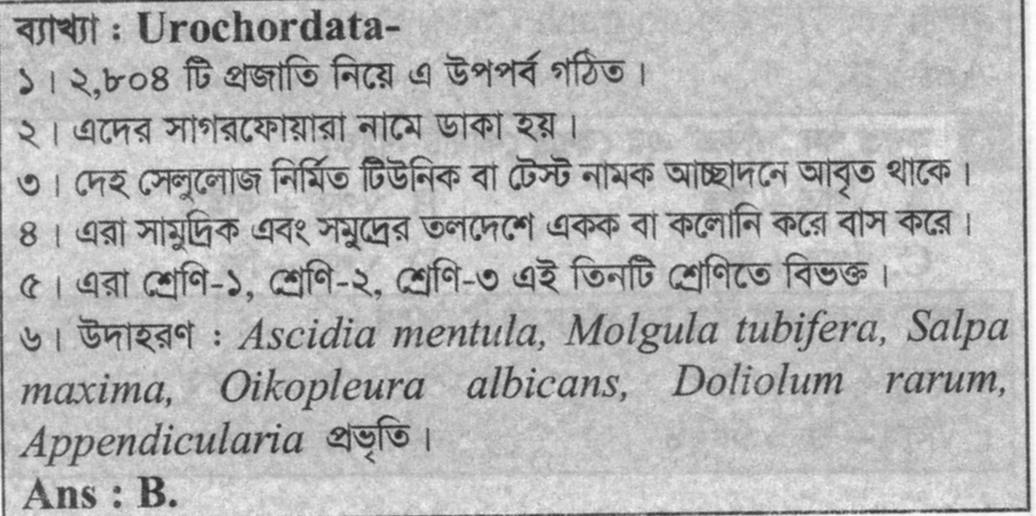 নিচের কোনটি সাগর ফোয়ারা (Sea Squirt) নামে পরিচিত? Option A: Echinodarmata , Option B: Cephalochordata , Option C: Cephalaspidomorphi, Option D: Urochordata, correct answer is: Urochordata