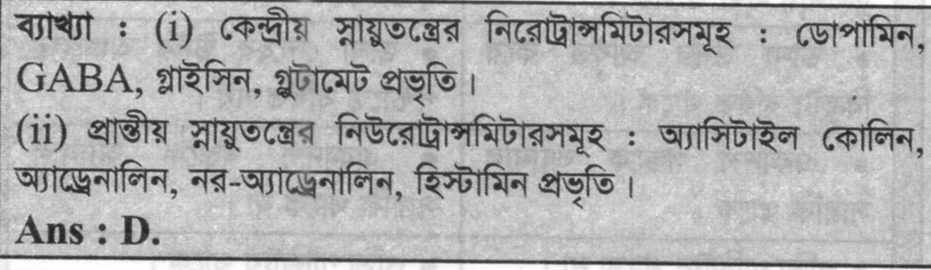 কোনটি কেন্দ্রীয় স্নায়ুতন্ত্রের নিউরোট্রান্সমিটার নয়?