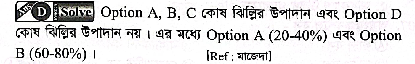 কোষের অম্লত্ব ও ক্ষারত্ব নিয়ন্ত্রণকারী অঙ্গাণু কোনটি? Option A: কোষ প্রাচীর , Option B: সাইটোপ্লাজম , Option C: কোষ ঝিল্লি, Option D: এন্ডোপ্লাজমিক রেটিকুলাম, correct answer is: সাইটোপ্লাজম