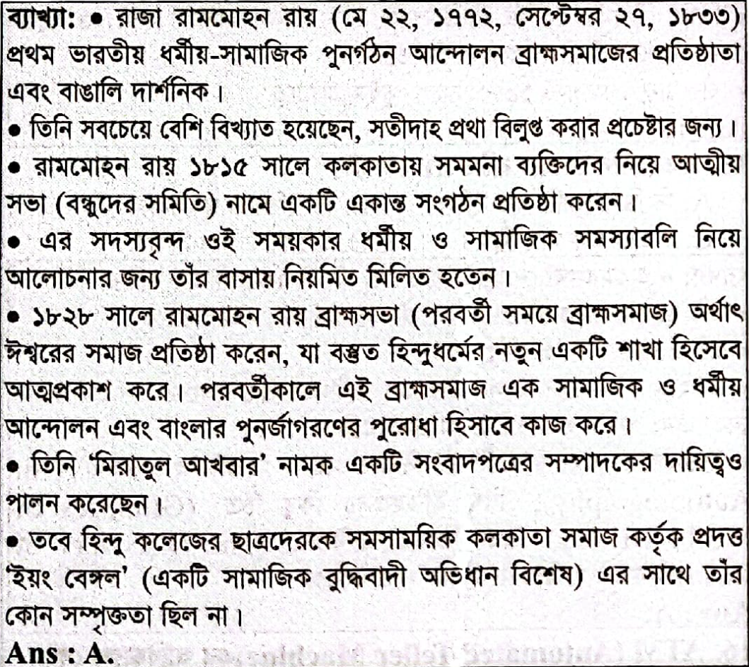 কোনটি রাজা রাম মোহন রায়ের সাথে সম্পৃক্ত নয়?