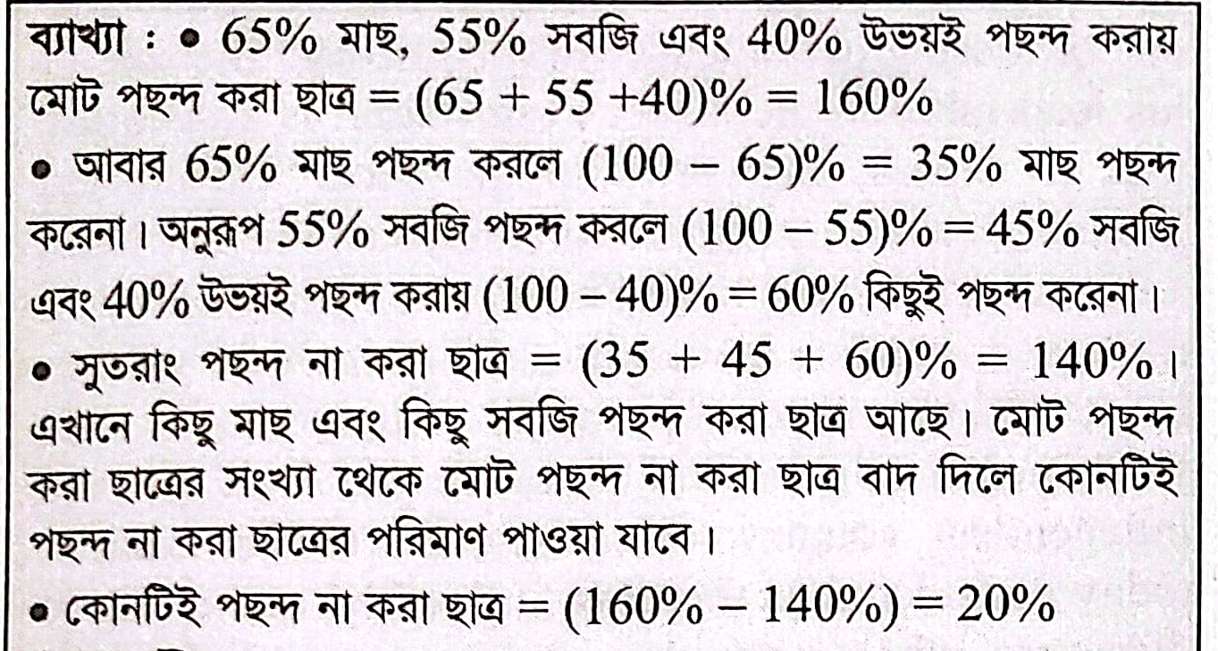 কোনো ছাত্রাবাসে ৬৫% ছাত্র মাছ পছন্দ করে, ৫৫% ছাত্র সবজি পছন্দ করে এবং ৪০% ছাত্র উভয়টি পছন্দ করে। কত শতাংশ ছাত্র কোনোটিই পছন্দ করে না? ( In a hostel, 65% students like fish, 55% vegetables, and 40% both fish and vegetables. What percentage of the students like none?)
