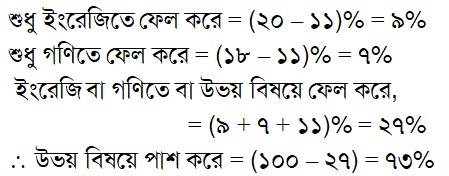 কোনো পরীক্ষায় ২০% পরীক্ষার্থী ইংরেজিতে, ১৮% পরীক্ষার্থী গণিতে এবং ১১% পরীক্ষার্থী উভয় বিষয়ে ফেল করেছে। শতকরা কতজন পরীক্ষার্থী উভয় বিষয়ে পাশ করেছে?