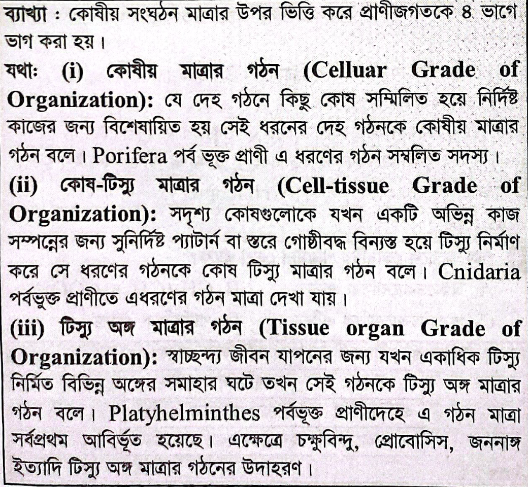 কোষীয় সংগঠনের ক্রমমাত্রার উপর ভিত্তি করে প্রাণীজগতকে কয় ভাগে ভাগ করা হয়েছে?