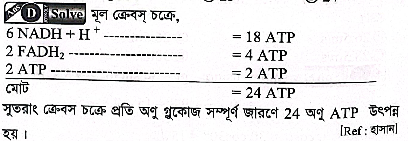 ক্রেবস চক্রে প্রতি অণু গ্লুকোজ সম্পূর্ণ জারণে কত অণু ATP উৎপন্ন হয় ?