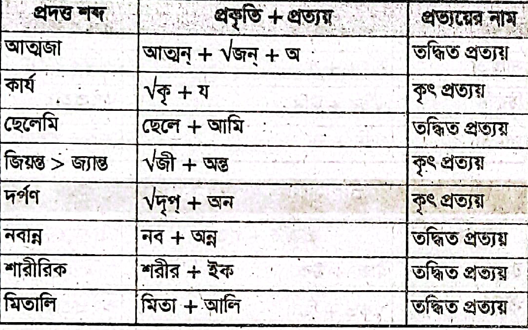 (ক) প্রত্যয়ের নামসহ প্রকৃতি ও প্রত্যয় নির্ণয় কর (যে কোন পাঁচটি)। আত্মাজ, কার্য, ছেলেমি, জ্যান্ত, দর্পণ, নবান্ন, শারীরিক, মিতালি।