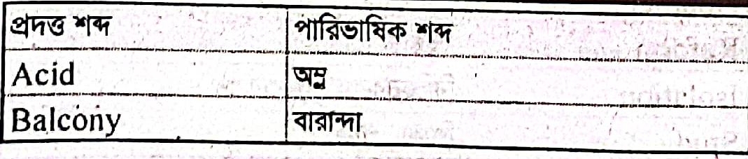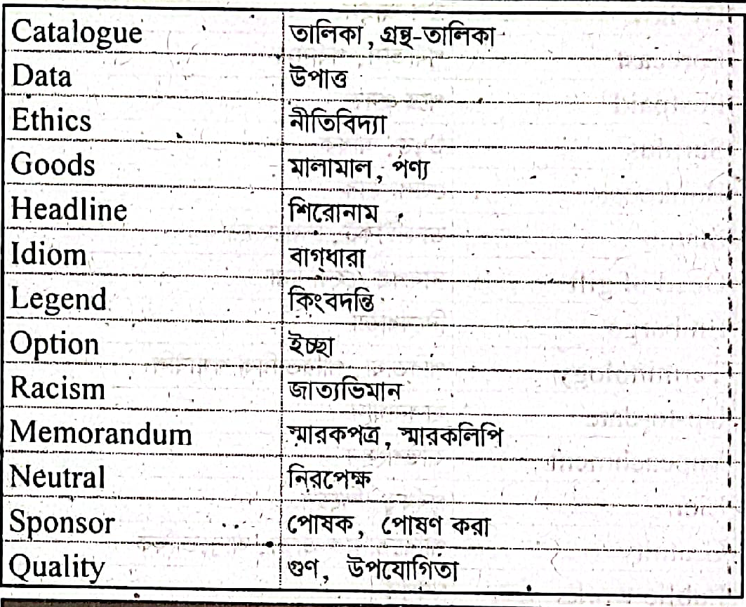 (ক) যেকোন দশটি শব্দের পারিভাষিক রুপ লেখঃAcid, Balcony, Catalogue, Data, Ethics, Goods, Headline, Idiom, Legend, Option, Racism, Memorandum. Neutral, Sponsor, Quality.