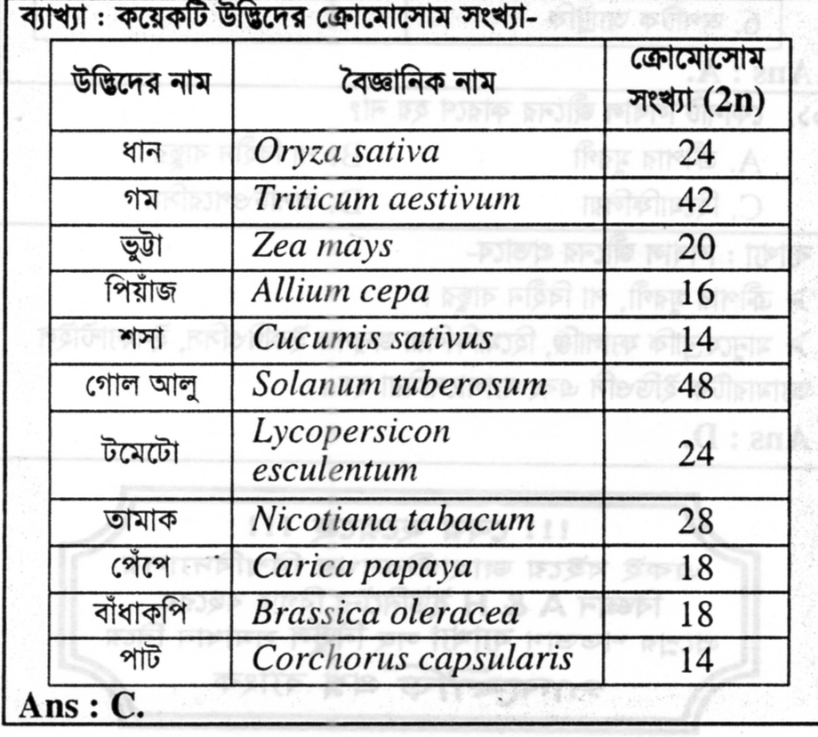 ক্রোমোজোমের প্রধান ও স্থায়ী রাসায়নিক উপাদান কোনটি? Option A: জিন , Option B: RNA , Option C: DNA, Option D: ক্লোরোপ্লাস্ট, correct answer is: DNA