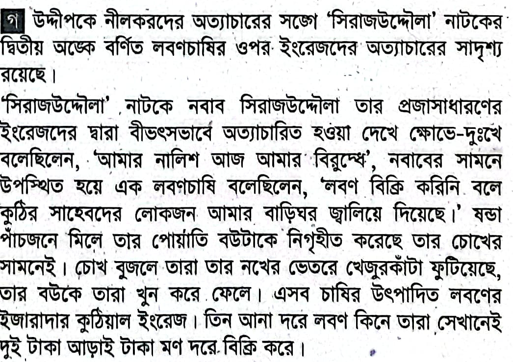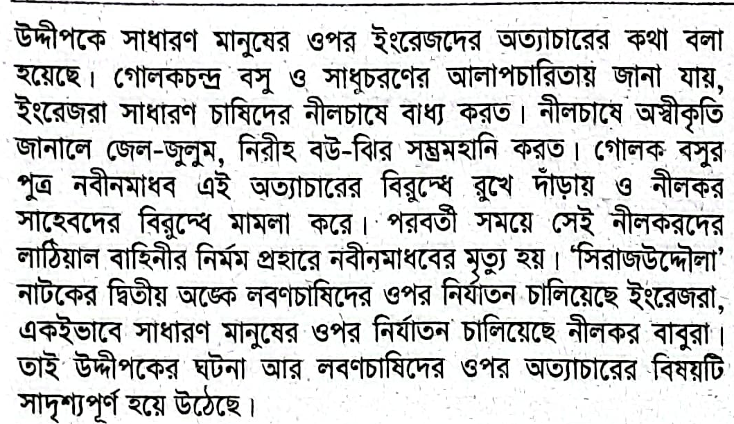 গোলকচন্দ্র বসু ও তাঁর রাইয়ত সাধুচরণের আলাপ-চারিতায় ফুটে ওঠে ইংরেজ কর্তৃক সাধারণ চাষিদের নীল চাষে বাধ্য করা, নীল চাষে অস্বীকৃতি জানালে জেল-জুলুম, নিরীহ বৌ-ঝির সম্ভ্রমহানি প্রভৃতি দৈনন্দিন কর্মকান্ডের অংশ। প্রজা পীড়নের বিরুদ্ধে রুখে দাঁড়ানোর জন্য গোলক বসুর পুত্র নবীন মাধব প্রতিবাদী হয়ে ওঠে এবং নীলকর সাহেবদের বিরুদ্ধে মামলা করে। একবার এক নীলকরকে বাগে পেয়েও চারিত্রিক ঔদার্যের কারণে সেই নীলকরকে কঠিন শাস্তি না দিয়ে ছেড়ে দেয়। অথচ পরবর্তী সময়ে সেই নীলকরদের লাঠিয়াল বাহিনীর নির্মম প্রহারে নবীন মাধব মৃত্যুবরণ করে। উদ্দীপকের নীলকরদের অত্যাচারের সঙ্গে `সিরাজউদ্দৌলা` নাটকের দ্বিতীয় অঙ্কে বর্ণিত ইংরেজদের অত্যাচারের তুলনা করো।
