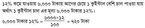 চালের মূল্য ১২% কমে যাওয়ায় ৬,০০০ টাকায় পূর্বাপেক্ষা ১ কুইন্টাল চাল বেশি পাওয়া যায়। ১ কুইন্টাল চালের বর্তমান মূল্য কত?
