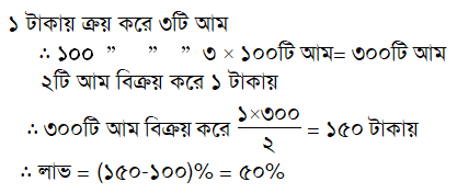 টাকায় তিনটি করে আম ক্রয় করে টাকায় ২টি করে বিক্রয় করলে শতকরা কত লাভ হবে?