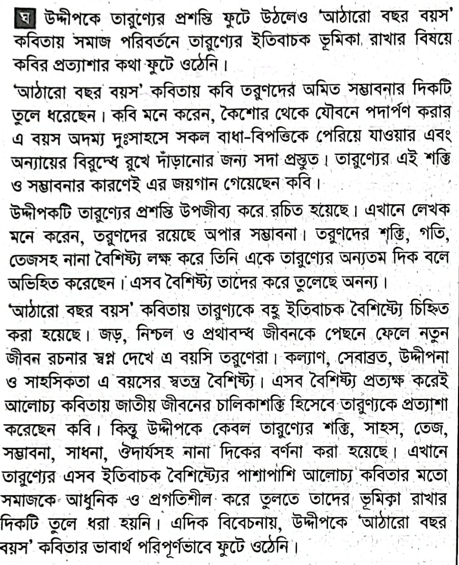 তরুণ নামের জয়মুকুট শুধু তাহারই-যাহার শক্তি অপরিমাণ, গতিবেগ ঝঞ্ঝার ন্যায়, তেজ নির্মেঘ আষাঢ় মধ্যরে মার্তণ্ডপ্রায়, বিপুল যাহার আশা, ক্লান্তিহীন যাহার উৎসাহ, অটল যাহার সাধনা, মৃত্যু যাহার মুঠিতলে। তরুণ অরুণের মতোই যে তারুণ্য তিমির-বিদায়ী, সে যে আলোর দেবতা। রঙের খেলা খেলিতে খেলিতে তাহার উদয়, রং ছড়াইতে ছড়াইতে তাহার অন্ত। যৌবন-সূর্য যেথায় অস্তমিত, দুঃখের তিমির-কুন্তলা নিশীথিনীর সেই তো লীলাভূমি।উদ্দীপকে `আঠারো বছর বয়স` কবিতার ভাবার্থ পরিপূর্ণভাবে ফুটে উঠেছে কি না, তা বিশ্লেষণ করো।
