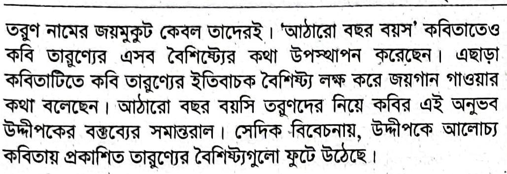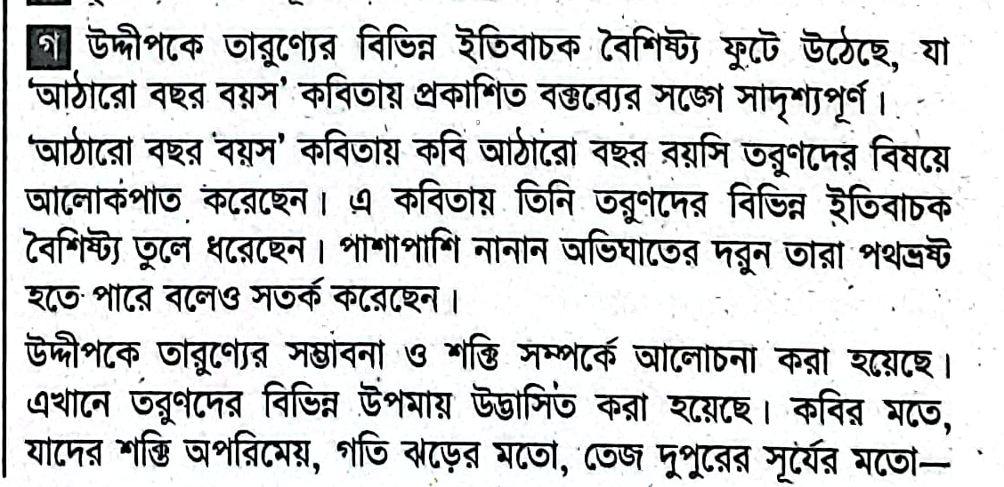 তরুণ নামের জয়মুকুট শুধু তাহারই যাহার শক্তি অপরমাণ, গতিবেগ ঝঞ্ঝার ন্যায়, তেজ নির্মেঘ আষাঢ় মধ্যাহ্নের মার্তণ্ড প্রায়; বিপুল যাহার আশা, ক্লান্তিহীন যাহার উৎসাহ, বিরাট যাহার ঔদার্য, অফুরন্ত যাহার প্রাণ, অটল যাহার সাধনা, মৃত্যু যাহার মুঠিতলে।উদ্দীপকের সাথে `আঠারো বছর বয়স` কবিতার সাদৃশ্যমূলক আলোচনা করো।