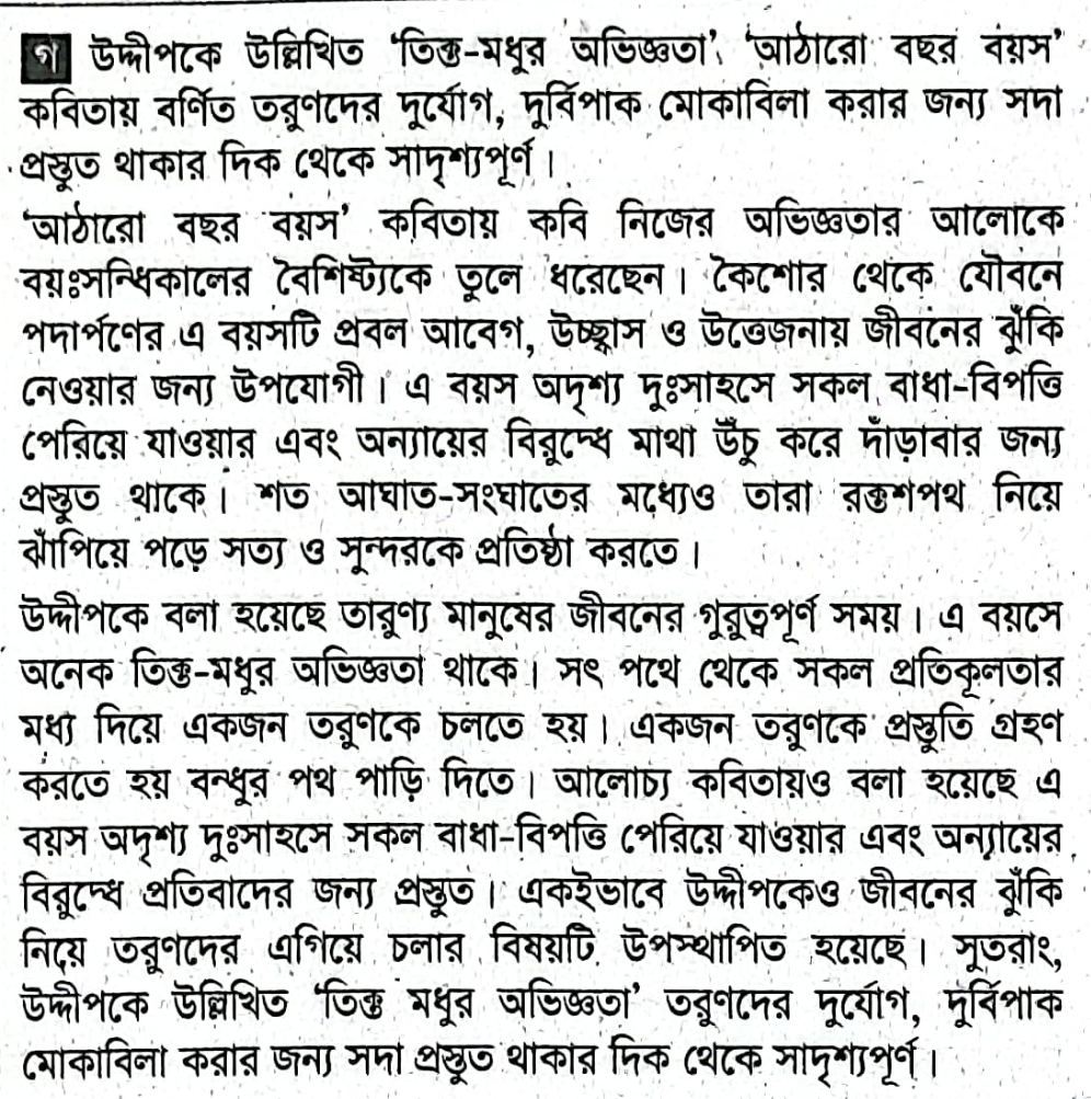 তারুণ্য হলো মানুষের জীবনে একটি গুরুত্বপূর্ণ সময়। এ বয়সে অনেক তিক্ত-মধুর অভিজ্ঞতা থাকে। পড়াশোনা শেষ করে চাকরির জন্য ছোটা, অর্থকষ্টে দিনাতিপাত করা; আবার যেকোনো অসৎ সঙ্গে নষ্ট হওয়া থেকে নিজেকে বাঁচিয়ে রাখা। এসকল প্রতিকূলতার মধ্য দিয়ে একজন তরুণকে পথ চলতে হয়। অর্থাৎ একজন তরুণকে বন্ধুর পথ পাড়ি দেওয়ার জন্য আগে থেকে প্রস্তুতি গ্রহণ করা বাঞ্ছনীয়।উদ্দীপকে উল্লিখিত `তিক্ত-মধুর অভিজ্ঞতা` `আঠারো বছর বয়স` কবিতার কোন বৈশিষ্ট্যের সাথে সাদৃশ্যপূর্ণ? বুঝিয়ে লেখো।
