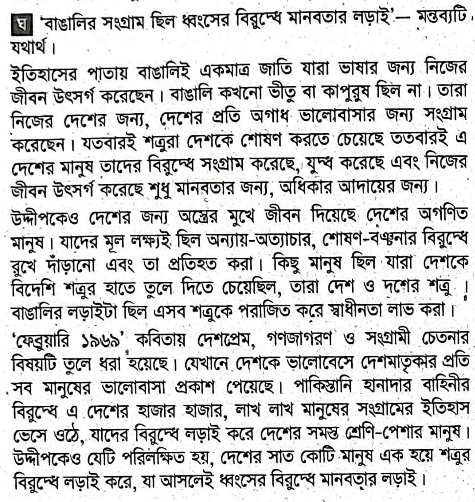 তোমার রাইফেল থেকে বেরিয়ে আসছে-জীবন তুমি দাও থরোথরো দীপ্ত প্রাণ বেয়নেটে নিহত লাশকে তোমার আগমনে প্রাণ পায় মরা গাছ পোড়া প্রজাপতি তোমার পায়ের শব্দে বাংলাদেশে ঘনায় ফাল্গুন ৫৬,০০০ বর্গমাইলের এই বিধ্বস্ত বাগানে এক সুরে গান গেয়ে ওঠে সাত কোটি বিপন্ন কোকিল। [মুক্তিবাহিনীর জন্য- হুমায়ুন আজাদ] `বাঙালির সংগ্রাম ছিল ধ্বংসের বিরুদ্ধে মানবতার লড়াই।` মন্তব্যটির যথার্থতা নিরূপণ করো।