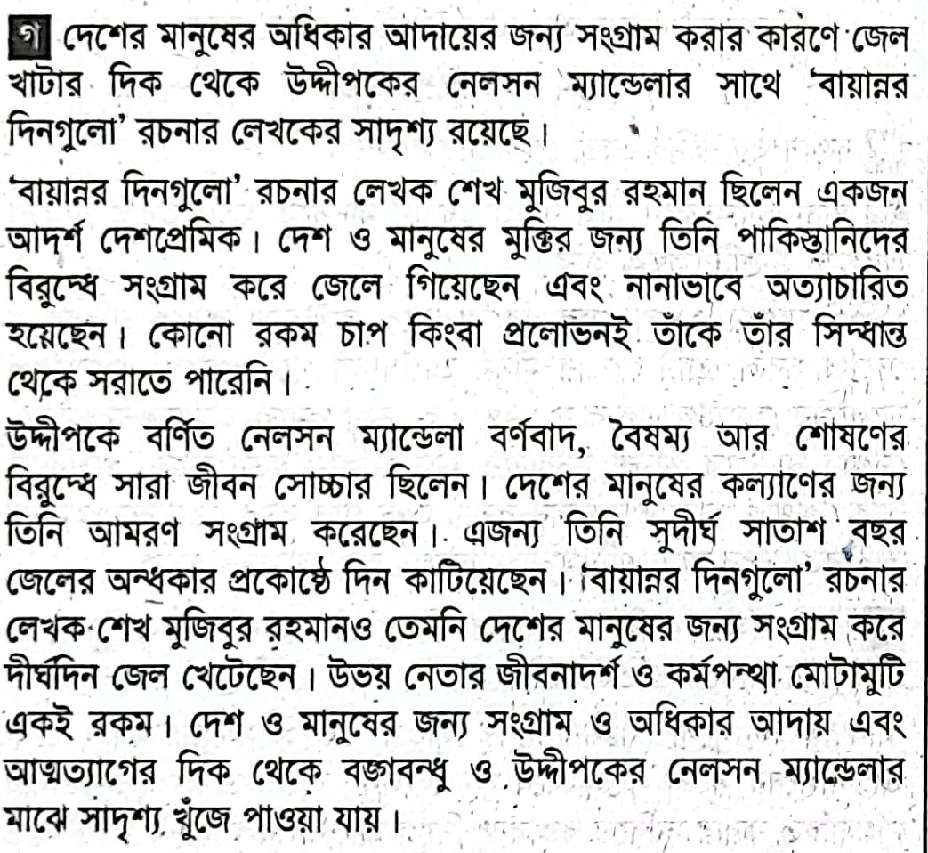 দক্ষিণ আফ্রিকায় বর্ণবাদী বৈষম্য যখন চরম আকার ধারণ করে, দেশটির কালো মানুষগুলোর অধিকার যখন ক্ষুণ্ণ হতে থাকে শ্বেতাঙ্গদের দ্বারা, ঠিক তখনই নেলসন ম্যান্ডেলা রুখে দাঁড়ান। বর্ণবাদবিরোধী আন্দোলনের তিনি ছিলেন প্রাণপুরুষ। শাসকদের দ্বারা তিনি বিভিন্নভাবে নির্যাতিত হয়েছেন। জীবনে বেশির ভাগ সময় তাঁকে কাটাতে হয়েছে কারাগারে। কিন্তু তিনি আন্দোলন করা থেকে পিছপা হননি। সংগ্রামের মাধ্যমেই তিনি প্রতিষ্ঠা করেছেন কালো মানুষের অধিকার।উদ্দীপকের নেলসন ম্যান্ডেলার সাথে `বায়ান্নর দিনগুলো` রচনার চারিত্রিক সাদৃশ্য রয়েছে? তুলনামূলক আলোচনা করো। নিজের মতামত বিশ্লেষণ করো।