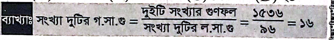 দুইটি সংখ্যার গুণফল ১৫৩৬। সংখ্যা দুটির ল.সা.গু ৯৬ হলে গ.সা.গু কত?