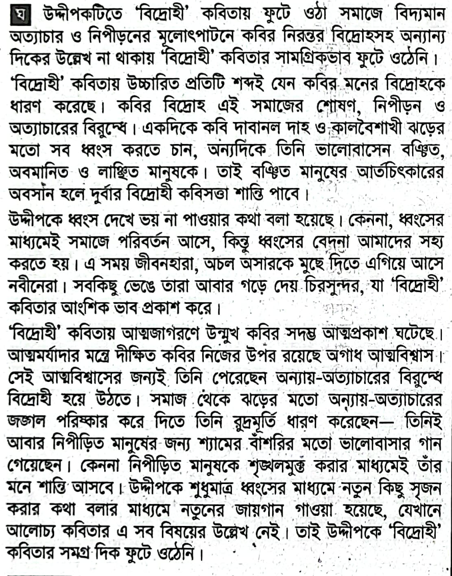 ধ্বংস দেখে ভয় কেন তোর?-প্রলয় নূতন সৃজন বেদন।আসছে নবীন জীবন-হারা অ-সুন্দরে করতে ছেদন।তাই সে এমন কেশে বেশেপ্রলয় বলেও আসছে হেসেমধুর হেসে।ভেঙে আবার গড়তে জানে সে চির-সুন্দর।তোরা সব-`জয়ধ্বনি কর।`উদ্দীপকে `বিদ্রোহী` কবিতার সমগ্র দিক ফুটে উঠেছে কি? তোমার মতের পক্ষে যুক্তি দাও।