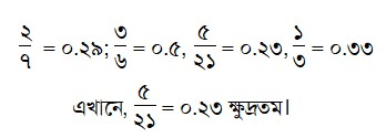 নিচের কোন ভগ্নাংশটি ক্ষুদ্রতম? Option A: 1/3 , Option B: 3/6 , Option C: 2/7, Option D: 5/21, correct answer is: 5/21