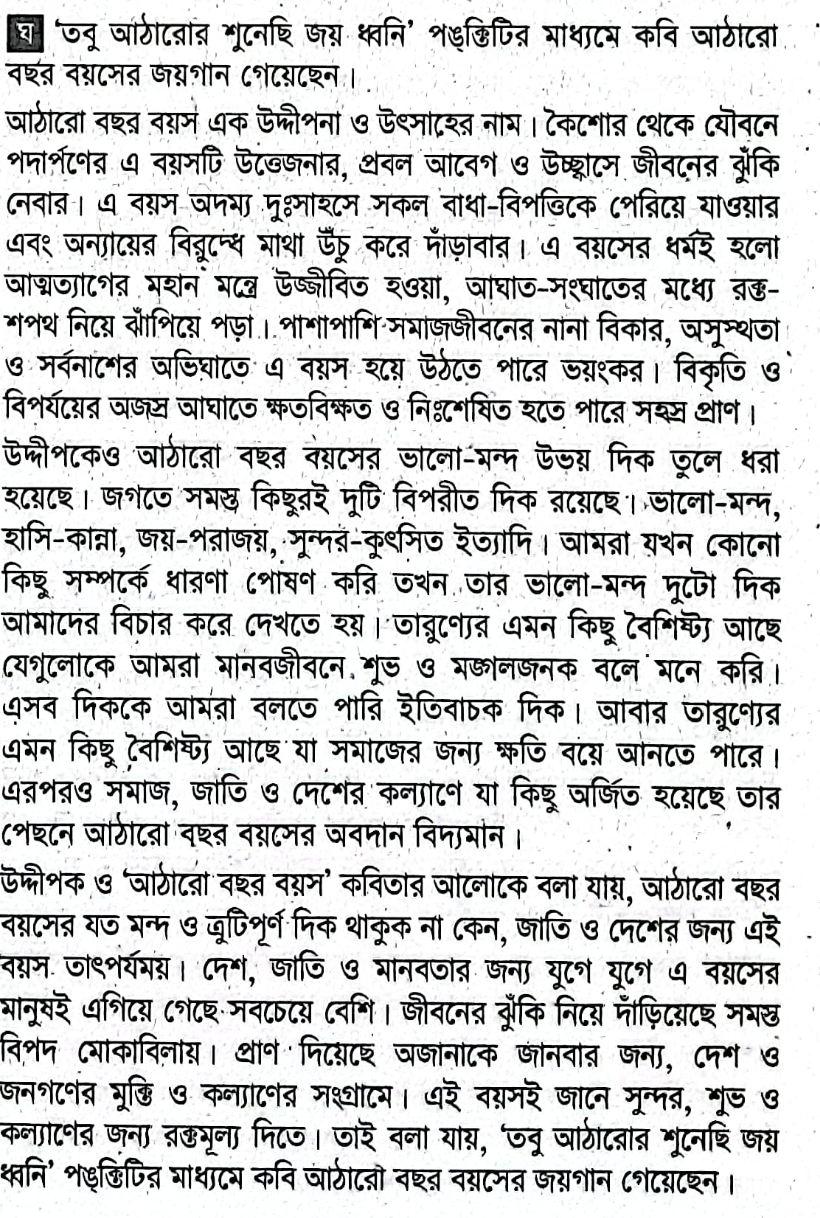 পাড়ার সকলের প্রিয় পল্টু। অদ্ভুত তার চরিত্র। এখনই কারো গাছের ফল চুরি করে খেলো, তো পরক্ষণেই শীতার্তকে নিজের গায়ের জামা খুলে দিয়ে দিলো। কখনো গৃহস্থের গরুর গলার রশি খুলে দিয়ে মজা করছে, কখনো মহিলাদের আড্ডায় রাবারের সাপ ছেড়ে দিয়ে আতঙ্ক সৃষ্টি করছে, কখনো পথচারীর গায়ে সাইকেল তুলে দিয়ে খিলখিল করে হাসছে। সেই পল্টই আবার প্রতিবেশীর বাড়িতে হামলা করা ডাকাত দলকে একাই রুখে দিতে লড়াই করছে। কারো বাচ্চাটাকে খুঁজে পাওয়া যাচ্ছে না, কারো অসুস্থ আত্মীয়কে হাসপাতালে নিতে হবে, কোনো কন্যাদায়গ্রস্ত পিতার বিয়ের সব ব্যবস্থাপনা করে দিতে হবে, কারো অন্ন-বস্ত্রের সংস্থান করতে হবে—এ সবে পল্টুই সর্বাগ্রে ।`তবু আঠারোর শুনেছি জয় ধ্বনি`-পঙক্তিটির আলোকে উদ্দীপকটিকে মূল্যায়ন করো।