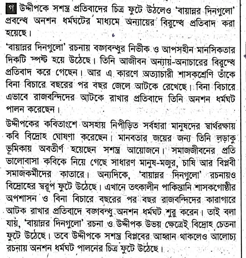 বন্ধু, তোমার ছাড়ো উদ্‌বেগ, সুতীক্ষ্ণ করো চিত্তবাংলার মাটি দুর্জয় ঘাঁটি বুঝে নিক দূর্বৃত্ত।মূঢ় শত্রুকে হানো স্রোতে রুখে, তন্দ্রাকে করো ছিন্ন,একাগ্র দেশে শত্রুরা এসে যাক নিশ্চিহ্ন।ঘরে তোলো ধান বিপ্লবী প্রাণ প্রস্তুত রাখো কাস্তে, গাও সারি গান, হাতিয়ারে শান দাও আজ উদয়ান্তে।উদ্দীপকে `বায়ান্নর দিনগুলো` রচনায় প্রতিবাদের ভাষার যে বৈসাদৃশ্য ফুটে উঠেছে তা নিজের ভাষায় লেখো।