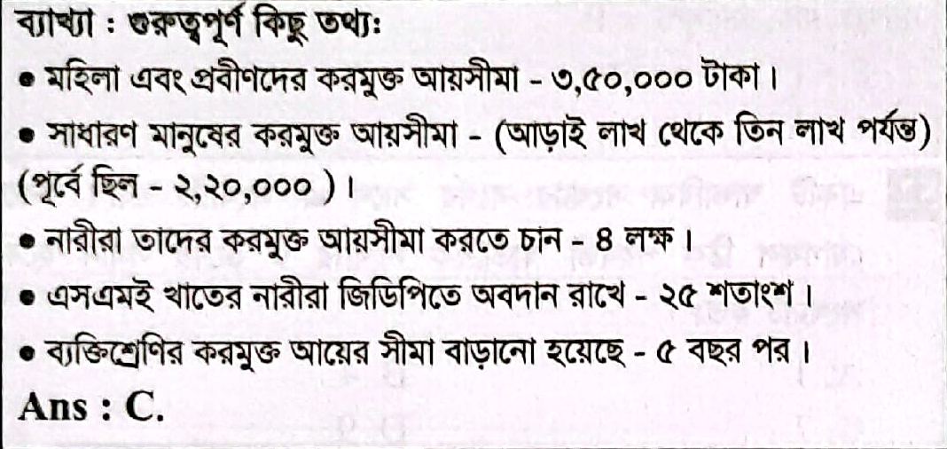 বাংলাদেশে মহিলা করদাতা এবং ৬৫ বছর বা তদূর্ধ্ব বয়সের পুরুষ করদাতার করমুক্ত আয়সীমা কত?