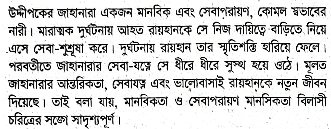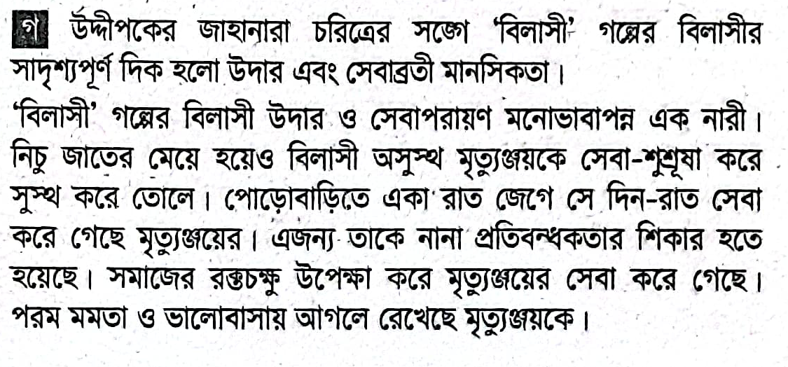 ভয়ংকর এক সড়ক দুর্ঘটনায় অচেতন অবস্থায় পড়ে থাকা রায়হানকে পাশের বস্তির মেয়ে জাহানারা উদ্ধার করে নিয়ে আসে। স্মৃতি ফিরে পেলে রায়হান জানতে পারে তার জীবন বাঁচিয়েছে এই মেয়েটি। দীর্ঘদিন সেবা-যত্নের পর ধীরে ধীরে সুস্থ হয়ে ওঠে সে। রায়হান মেয়েটির প্রতি কৃতজ্ঞতাবোধ থেকে তাকে বিয়ে করে বাড়িতে নিয়ে আসে। তার বাবা জাহানারাকে মেনে নেয় না। কিছু টাকা পয়সা দিয়ে তাকে-বিদায় করে দিতে চাইলে রায়হানও জাহানারার সাথে বস্তিতেই চলে যায় এবং সেখানেই সুখে সংসার বাঁধে।উদ্দীপকের জাহানারা চরিত্রের সাথে `বিলাসী` গল্পের বিলাসীর সাদৃশ্যপূর্ণ দিকটি আলোচনা করো।